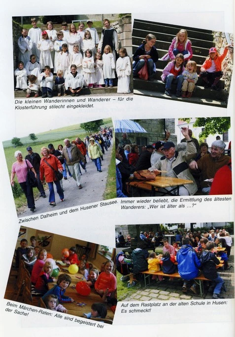 Nach dem Museumsbesuch stand die eigentliche Wanderung auf dem Programm. Ziel war das etwa fünf Kilometer entfernte Husen. Der Weg führte vom Kloster am ehemaligen Forstamt Dalheim und am Dalheimer Arboretum vorbei durch den Wald über den Nordwesthang des Großen Schalksberges zum Husener Stausee, wo in Form kühler Getränke und süßer Brötchen eine kleine Zwischenstärkung auf die Wandergruppe wartete. Und dann ging es im Altenau-Tal weiter in Richtung Husen, dabei aufmerksam den Himmel im Blick behaltend, der allmählich ein unfreundliches Aussehen angenommen hatte. Endpunkt der Wanderung in Husen war die direkt hinter der Kirche liegende alte Volksschule, die heute den örtlichen Vereinen, so auch dem Husener Heimatverein, als Domizil dient.
