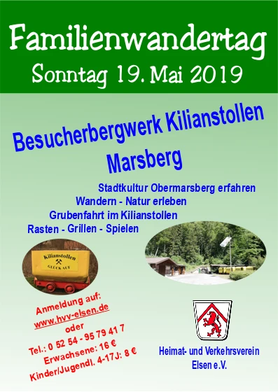 Es war wieder ein erlebnisreicher Tag für viele Elsener Familien, das Wetter spielte mit und alle Teilnehmer hatten viel Spaß beim traditionellen Familienwandertag am 19. Mai in diesem Jahr. Morgens um 9 Uhr brachte uns der Bus zum Wanderausgangpunk auf den Eresberg in Obermarsberg. Nach kurzer Begrüßung durch Otto Tilmann startete die Wanderung entlang kulturhistorischer Gebäude, wie der Stiftskirche "St.Petrus und Paulus" als eine der ältesten Kirchen Westfalens, dem Alten Rathaus mit Pranger, dem Heimatmuseum und der Nikolaikirche bis zum Besucherbergwerk. An den einzelnen historischen Stätten erklärte uns dankenswerterweise Franz-Josef Stoiber den geschichtlichen Hintergrund, der bis Karl dem Großen im Jahre 800 zurückreicht.
