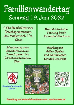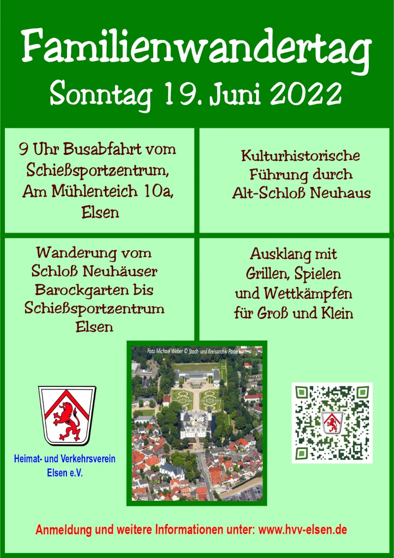 In diesem Jahr führte uns der Familienwandertag des Heimat- und Verkehrsvereins Elsen e.V. in das benachbarte Schloß Neuhaus. Morgendlicher Treffpunkt aller Beteiligten war das Schießsportzentrum in Elsen, von wo uns der Bus nach Schloß Neuhaus brachte. Begleitet vom Glockenklang der Pfarrkirche St. Heinrich und Kunigunde nahm uns dort der bekannte Kreisheimatpfleger Michael Pavlicic auf dem Platz vor der Pfarrkirche in Empfang. Die erste Station führte uns in den Innenhof des Schlosses, um anschließend zügig aufwärts in das Turmzimmer zu gelangen. Der Lohn für den anstrengenden Aufstieg war ein herrlicher Blick aus der Höhe auf den Barockgarten. Diese Aussicht bleibt den Besuchern im Regelfall verwehrt, da hier der Probenraum eines Musikvereins beheimatet ist. Nach der Rückkehr aus dem Turmzimmer nahm sich Michael Pavlicic im Innenhof des Schlosses ein wenig Zeit, um über dessen Geschichte, die Historie der Orte Schloß Neuhaus und Elsen sowie über verschiedene gut erhaltene Bauten aus dem historischen Ortskern zu berichten. In seine Berichte streute er zahlreiche Anekdoten und Geschichten aus dem Leben der Schloß Neuhäuser ein, wobei er zahlreiche Verbindungen auch zu verschiedenen Elsener Familien zog. Ausgestattet mit einer Fülle an Informationen machten wir uns nun auf den Weg durch den historischen Ortskern und durften so manch aufwendig restauriertes Fachwerkhaus bewundern. Nebenbei erwähnt sei, dass sich in Schloß Neuhaus die längste Fachwerkstraße im Kreis Paderborn befindet.