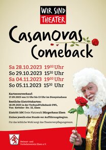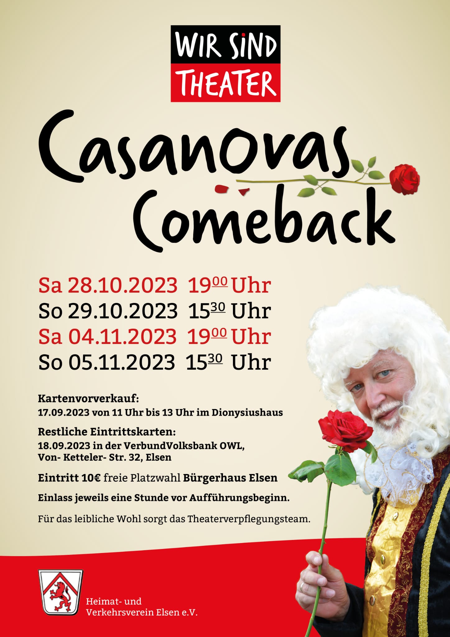 Die Theatertruppe „Wir sind Theater“ des Heimat- und Verkehrsvereins Elsen konnte mit vier Aufführungen der Komödie „Casanovas Comeback“ von Andreas Wening am 28/29 Okt und 4/5 Nov 2023 begeistern.
