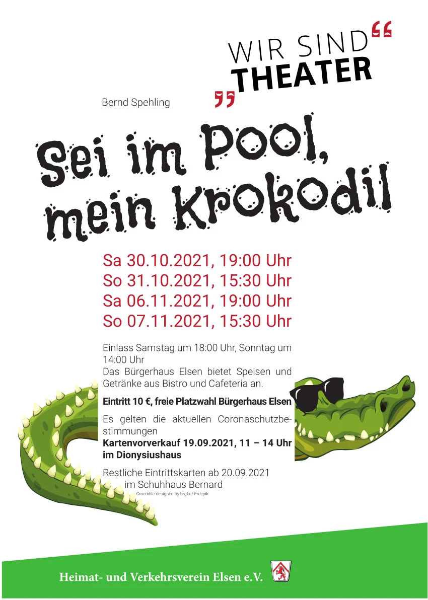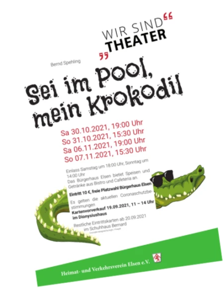 Die Laienspielgruppe des HVV verlängerte den Sommer. Nach der langen Pause im vergangenen Jahr meldete sich das Ensemble mit seinem fünften Theaterstück „Sei im Pool mein Krokodil“, einer Komödie von Bernd Spehling, zurück. Das Elsener Bürgerhaus verwandelte sich in die Ferienanlage „Blue Sirenis“. Dort traffen sich die unterschiedlichsten Gäste zum Cluburlaub. Ob vom Navi fehlgeleitet, zur Abwendung eines Burnouts oder zur Familiengründung, alle traffen sich am Pool.