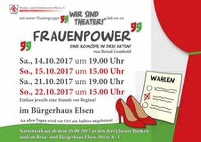 Viele Elsener folgten wieder der Einladung der Theatergruppe des Heimat- und Verkehrsvereins an den zwei Wochenenden am 14/15. und 21/22. Oktober 2017 zur Aufführung des lustigen Stücks "FRAUENPOWER" von Bernd Gombold.